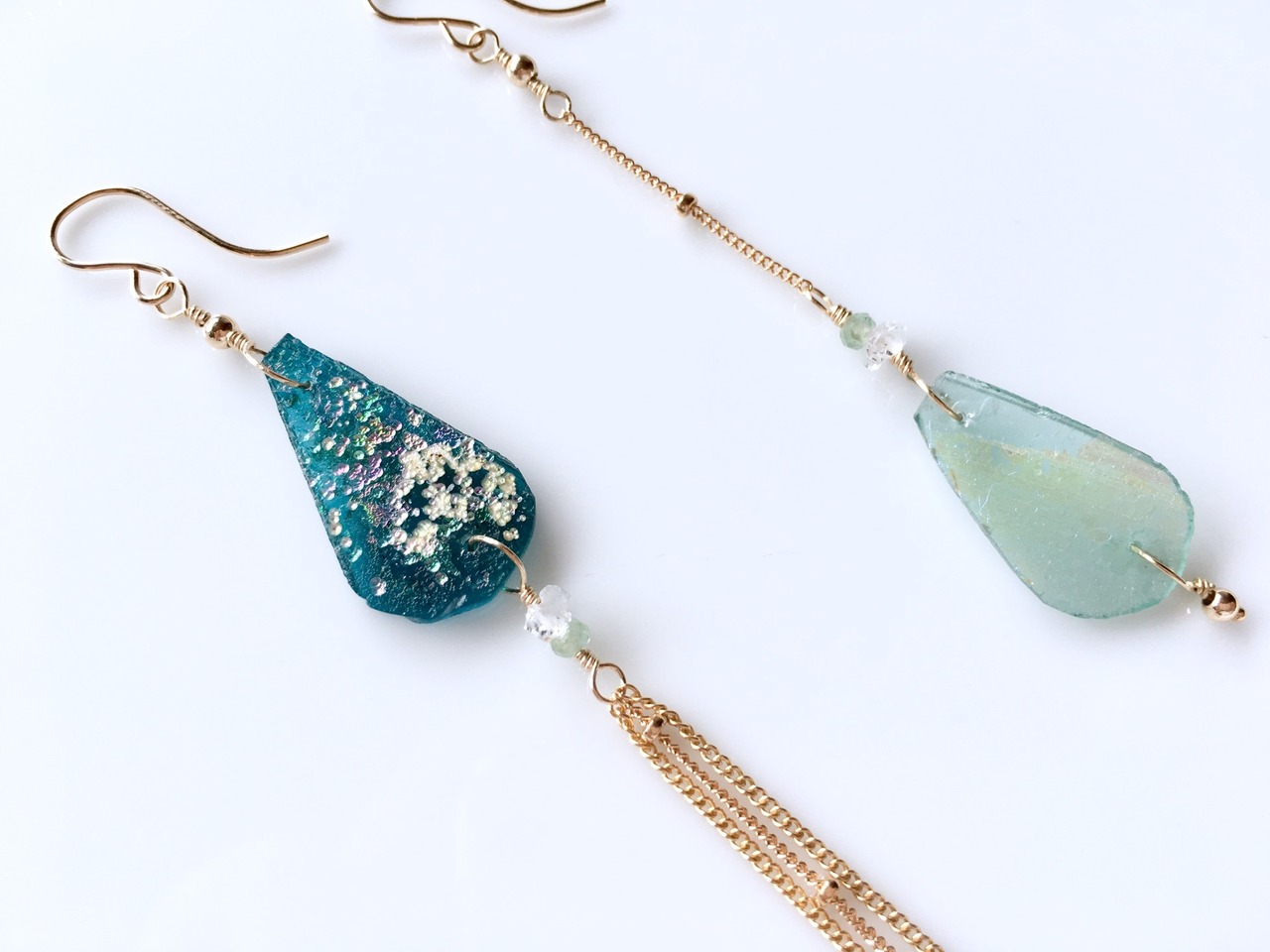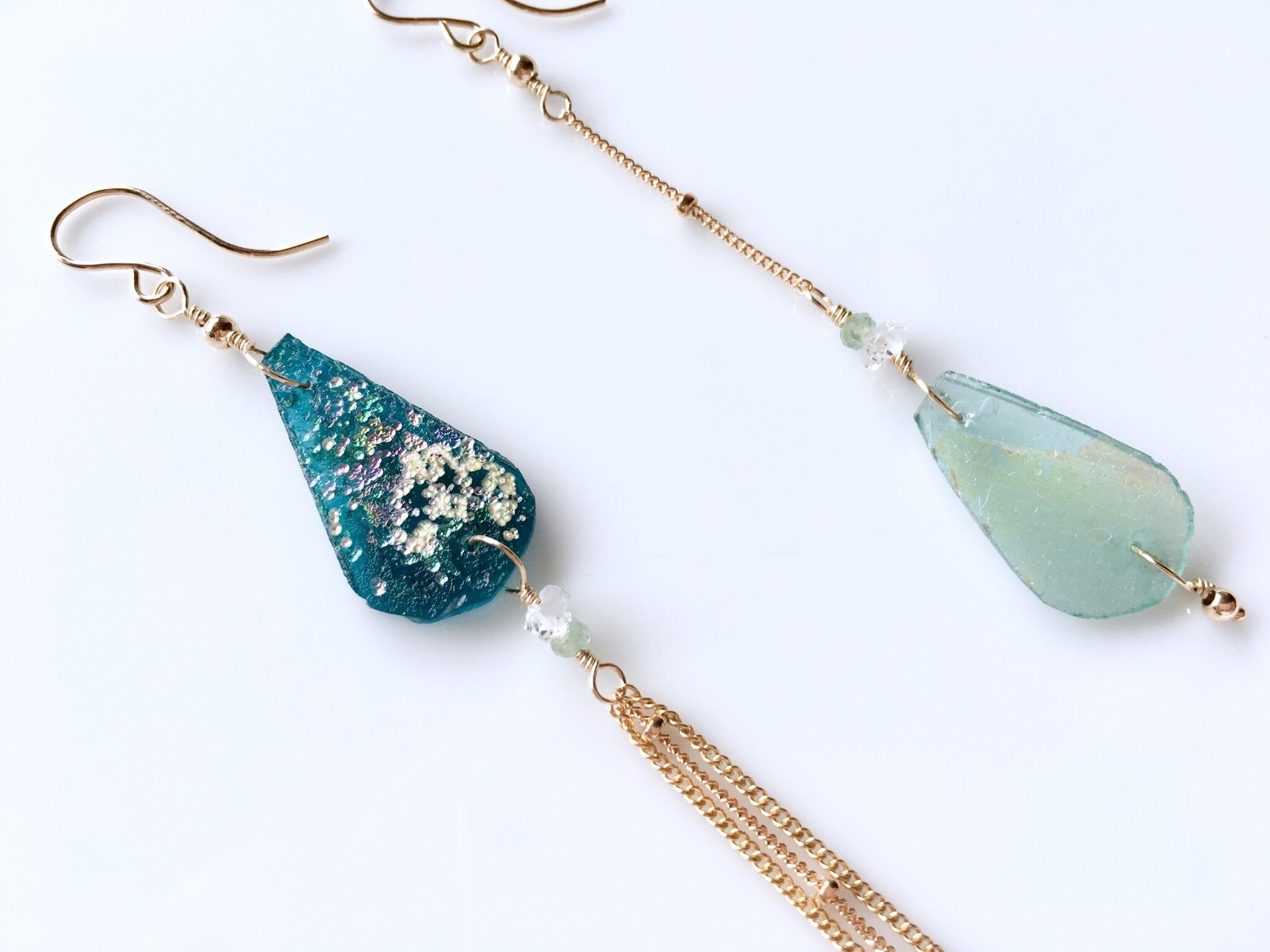 角度によってイエロー〜ブルーに変化するラムネ色のローマングラス。